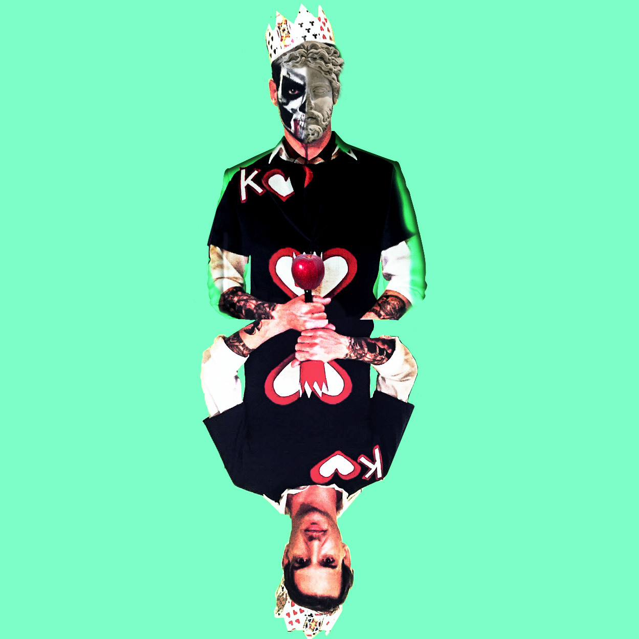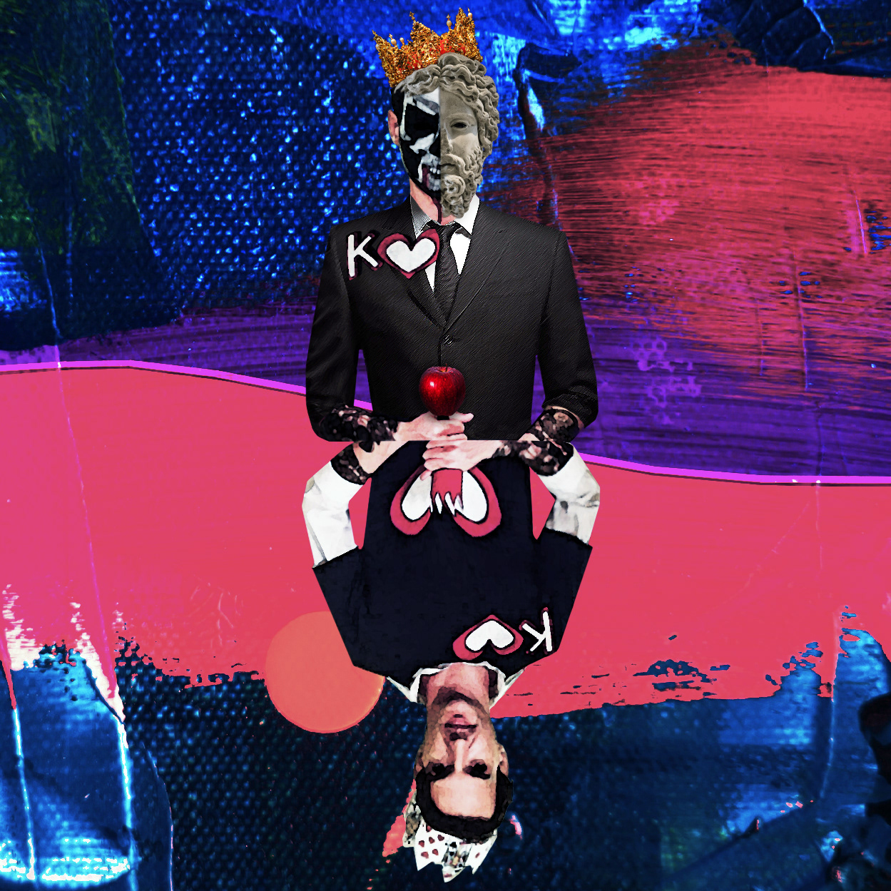 A digital collage of my dual identity as a king. This piece explores the contrast between appearance and reality, power and vulnerability, tradition and innovation. I used photos of my Halloween costume and various textures I created myself to compose two versions of a king: one in a makeshift outfit and one in a formal suit with a gold crown. The former represents my playful and creative side, while the latter reflects my dark and ambitious side.