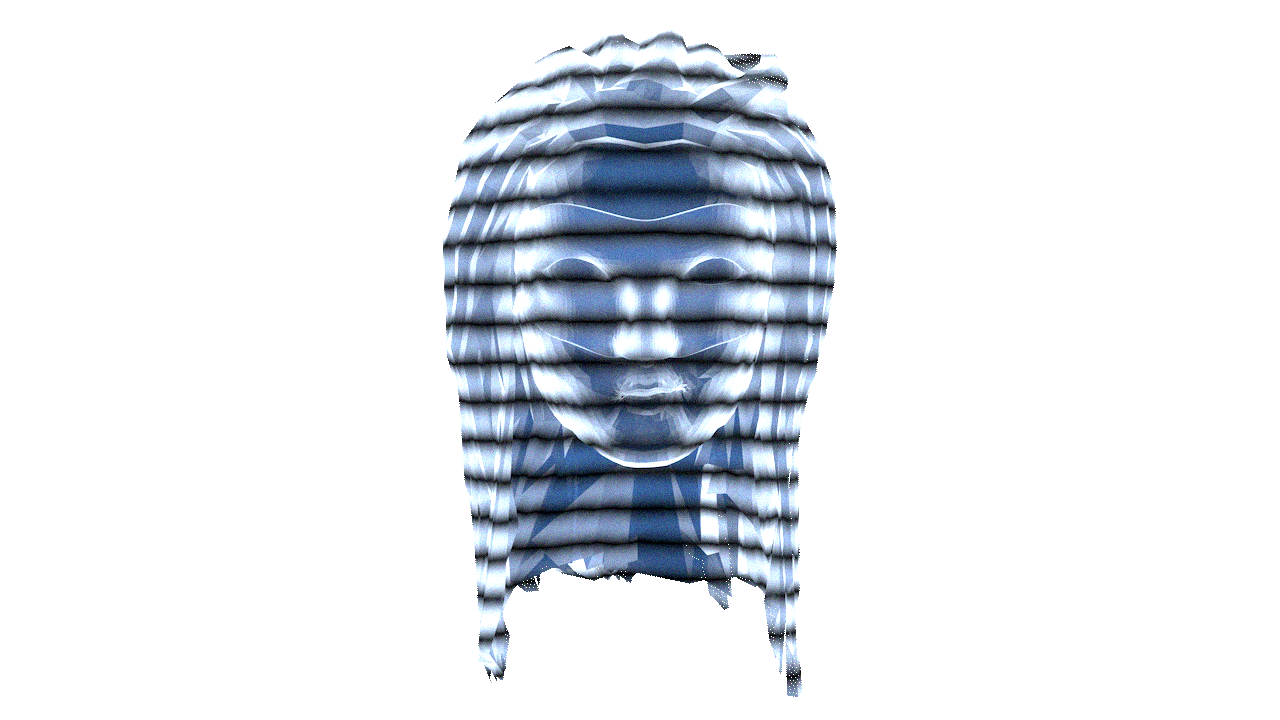 A custom hologram shader I created in Blender. I sculpted the low poly head in Blender and added some noise in postprocessing.