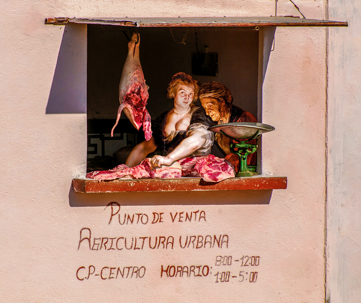 This collage is one of my early works, where I experimented with combining different sources and styles. I used a public domain photo from Wikipedia and a Renaissance painting to create a contrast between the modern and the classical. The collage depicts a scene of two elderly women in a Cuban market, slicing and selling pork. I wanted to capture the cultural significance of pork as a staple food in Cuba, as well as the contrast between the mundane and the sublime.